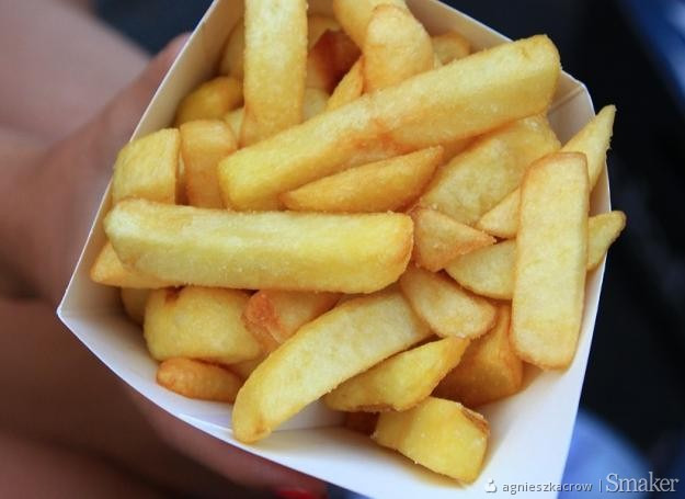 łosoś smażony na maśle, frytki - podawany na pierzynce z sałaty i warzyw -