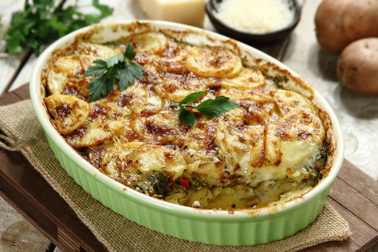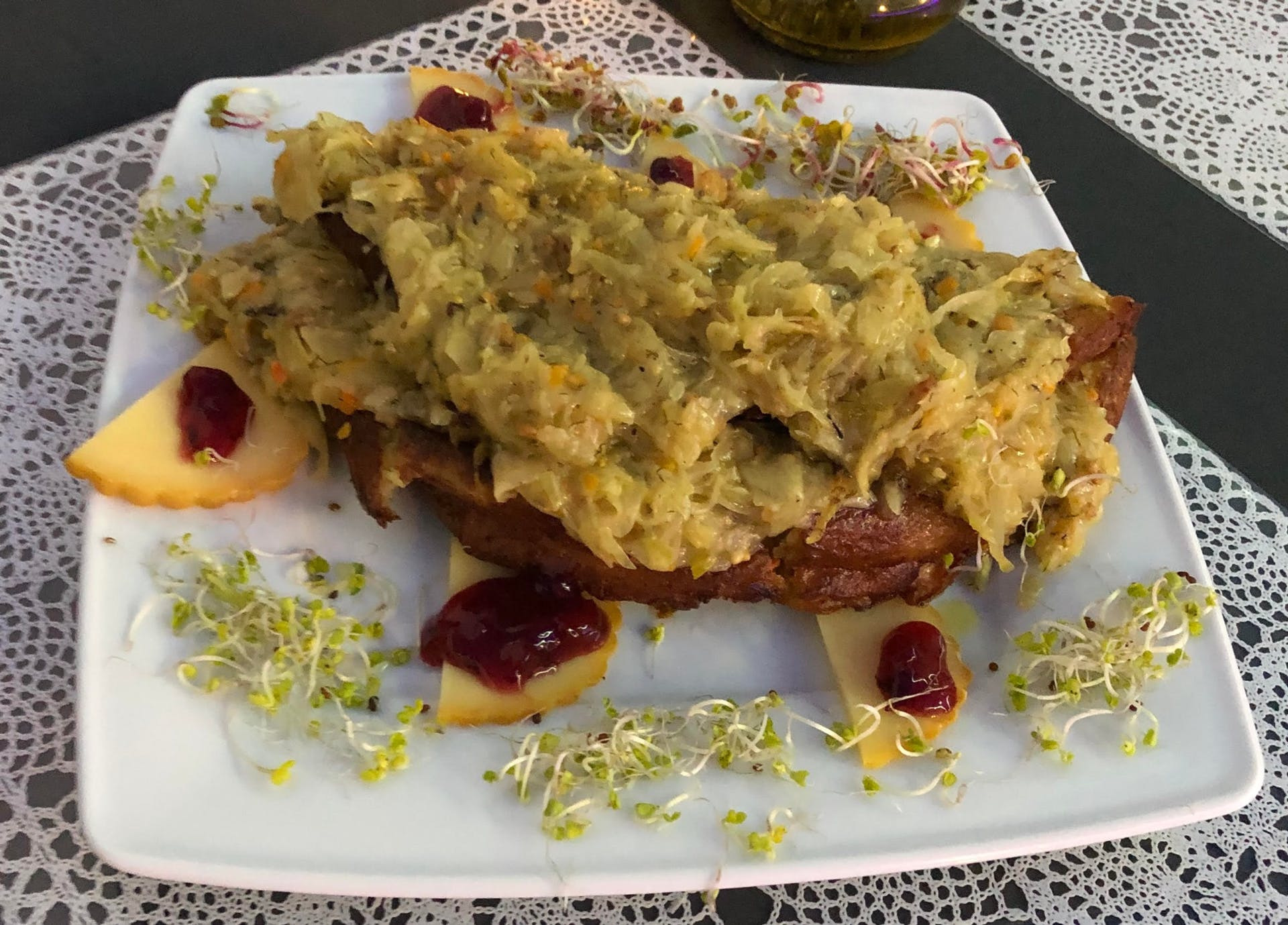 Placek ziemniaczany, bekon, sos czosnkowy, ser wędzony , pieczony camembert z żurawiną