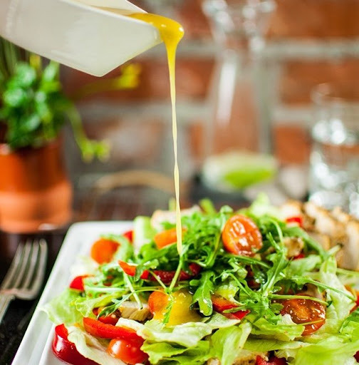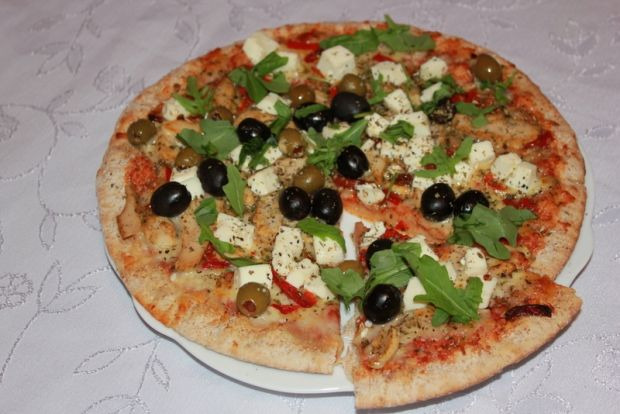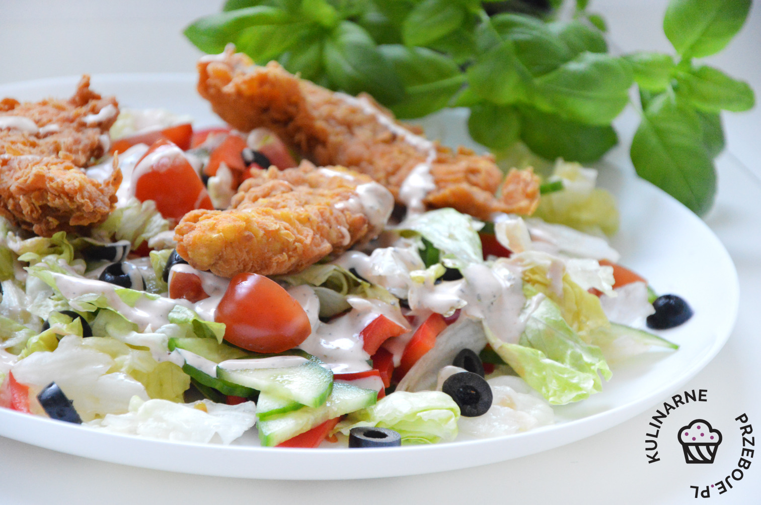 sałata, papryka, pomidor, ogórek, oliwki, cebula, kurczak gyros, sos tysiąca wysp