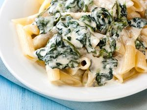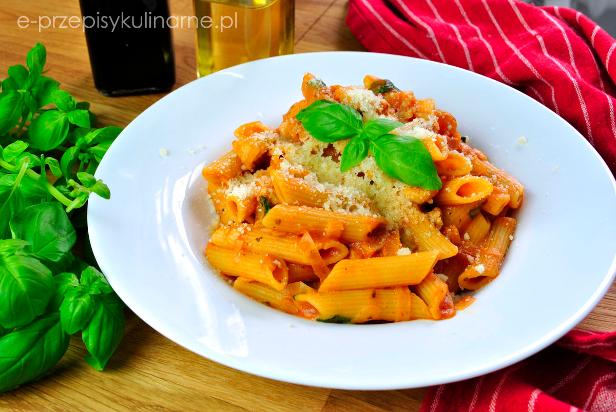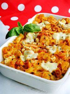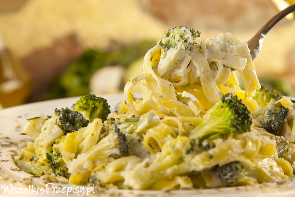 makaron tagliatelle, sos bazyliowo - śmietanowy, kurczak, czosnek, pomidory koktajlowe -