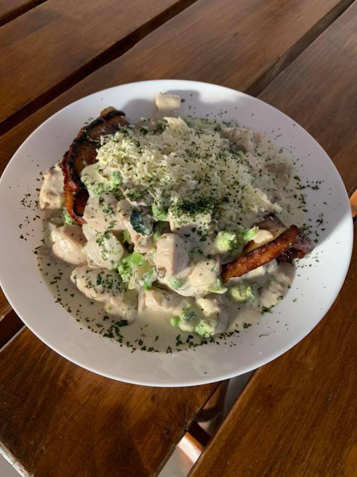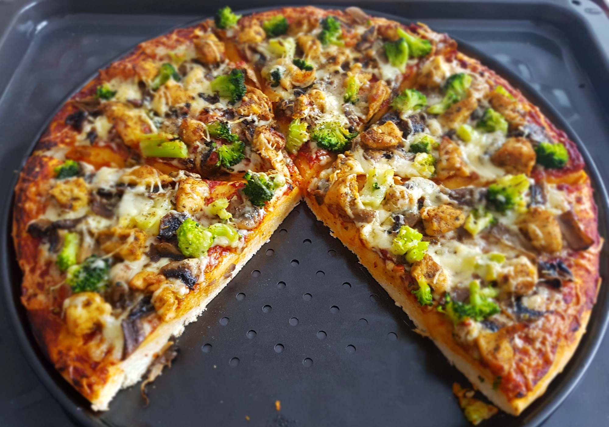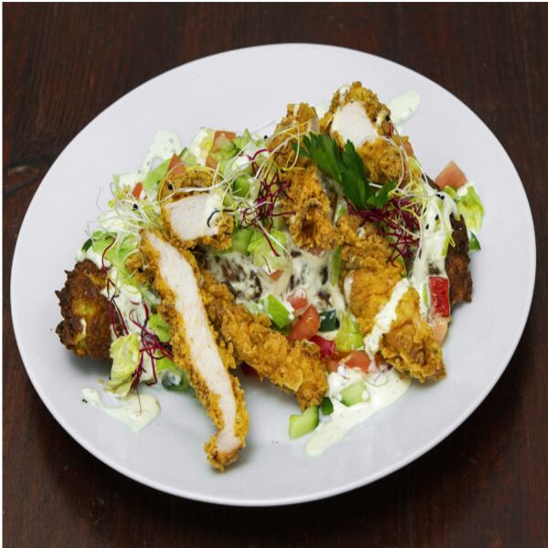 grillowana pierś z kurczaka z pieczarkami zapiekana serem cheddar, pomidor koktajlowy, cebula, rukola, sos czosnkowy.