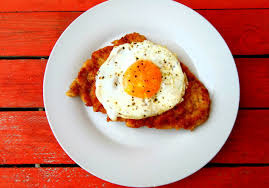 placek ziemniaczany,boczek,cebula,szczypiorek,sos śmietanowy,żółtko,jajko sadzone -