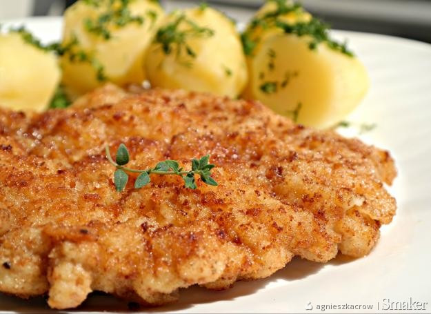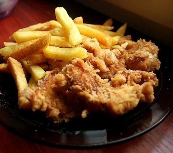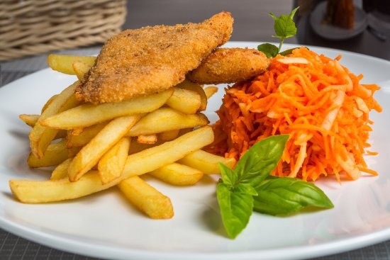 sandacz w złocistej panierce, frytki, zestaw surówek