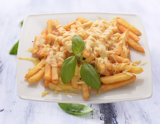 opiekane aromatyczne mięso z kurczaka, frytki, sałatka z sałaty lodowej, sos czosnkowy -